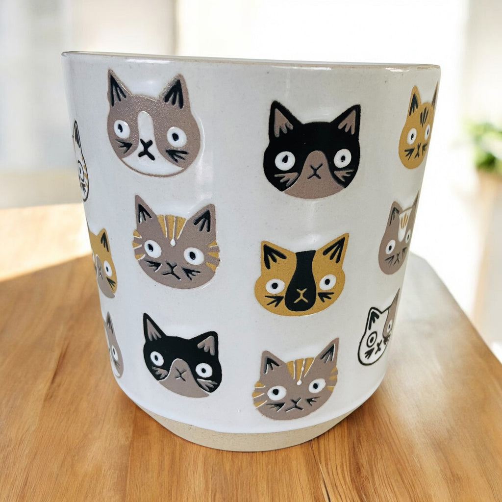 The smooth white glaze is paired with a darker beige raw ceramic base for an earthy, handcrafted touch. Hand glazed and hand painted in shades of black, grey, mustard, and white, no two mugs are exactly alike—each one has its own charmingly confused crew of cats.