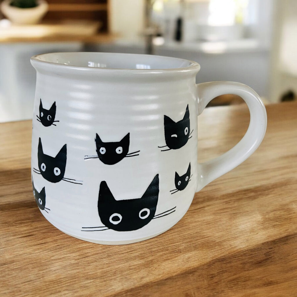 Meet your new favorite mug! This charming ceramic beauty features whimsical black cat faces scattered throughout—most sweetly staring back at you, with a few cheeky winks mixed in.
