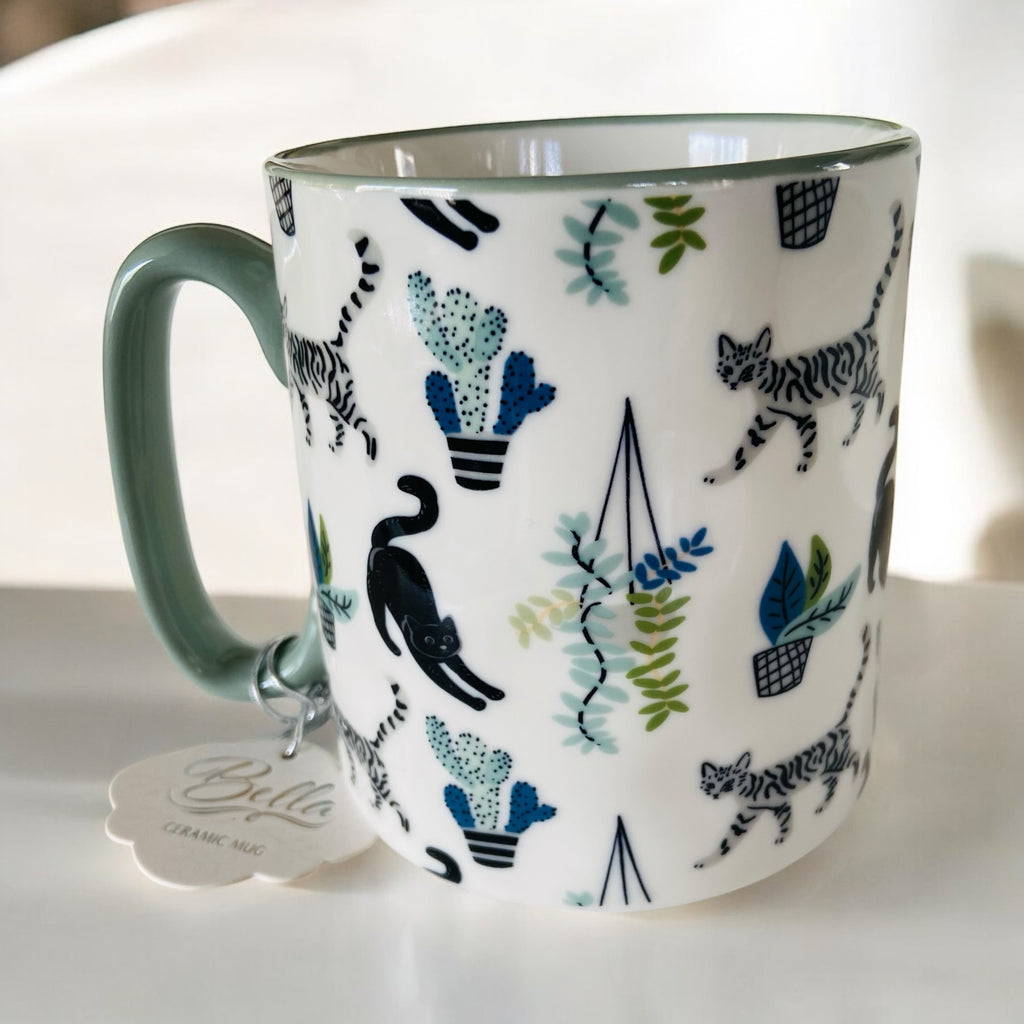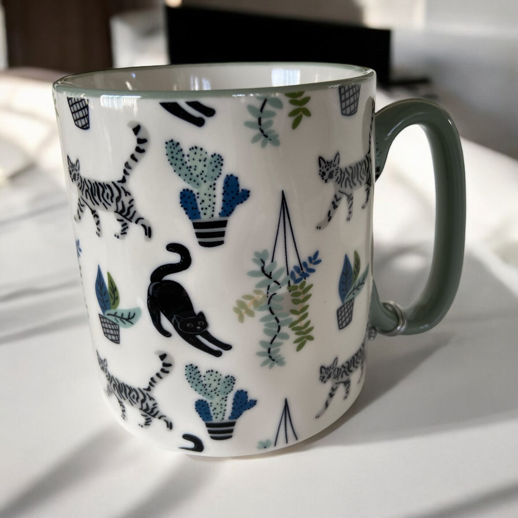 Featuring black cats and grey tabby cats playing among a garden of cactus and various succulents, this mug is a must have for a peaceful cup of morning coffee or a serene cup of evening tea.