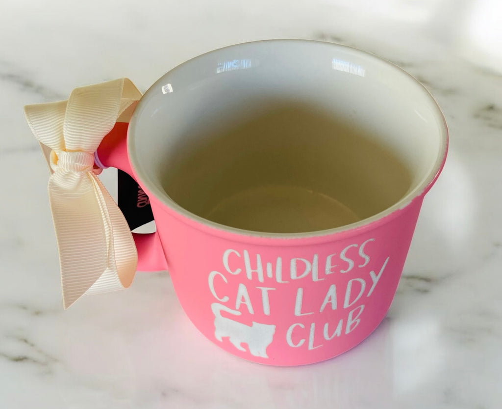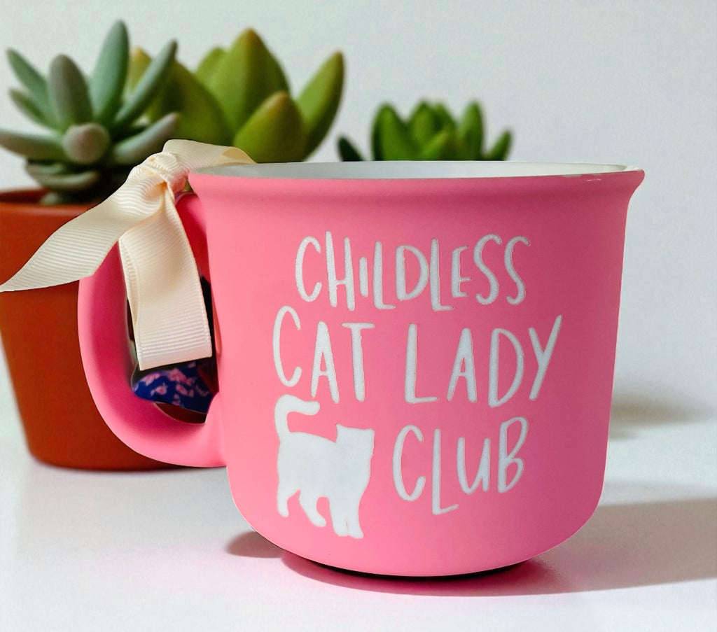 Proudly sip your coffee, tea, or cat-themed cocoa in style with this bright pink statement mug. Featuring the words “Childless Cat Lady Club” in shimmering white lettering, alongside a chic white kitty illustration, this mug celebrates your unapologetic love for feline companionship.
