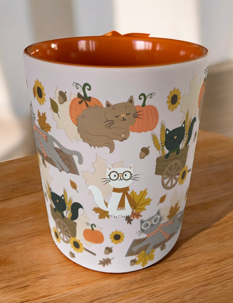 This charming dusty-pink mug (with a warm orange interior!) is covered in adorable fall-ready felines: a black cat riding in a wheelbarrow, scarf-snuggled orange kitties, and a sweet brown cat curled up beside pumpkins. It’s a heartwarming scene wrapped all the way around your cup—pure cozy cat magic.